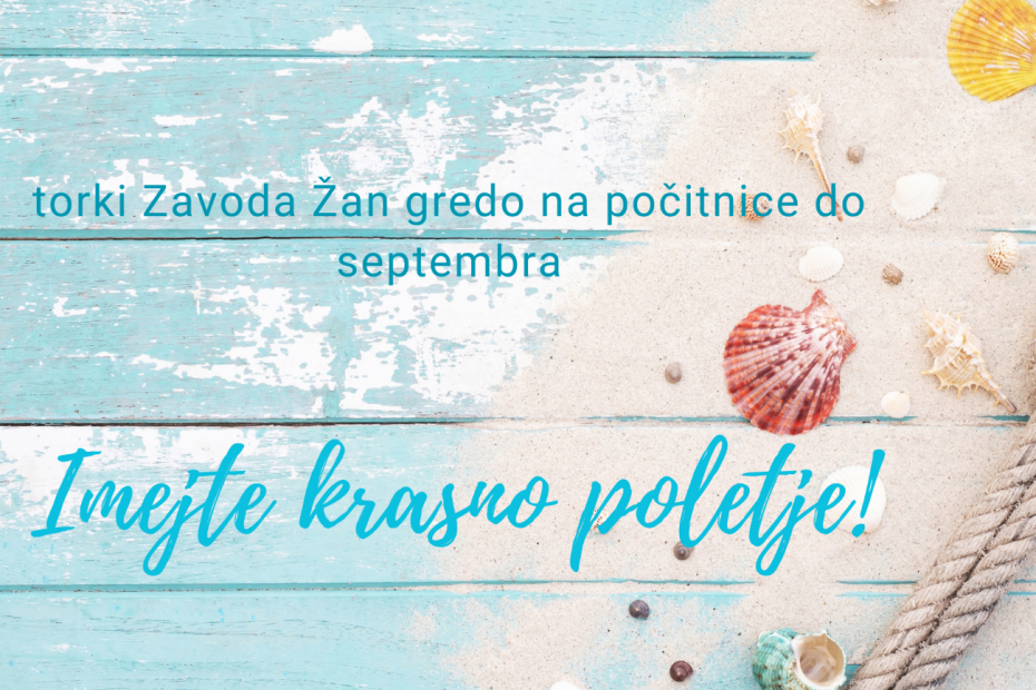 Pozdravljeni, poletni dnevi in večeri so za ovinkom in v tem času gredo torkova srečanja na počitnice. Se vidimo spet septembra, polni energije, D vitamina in novih idej. Uživajte v čričkih, ptičkih, sladoledih in poletnem veselju!